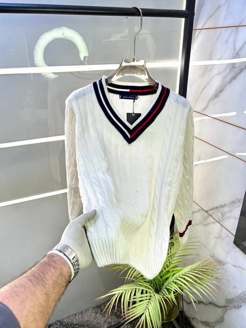 Tommy_Hilfiger Imported White knitted V Neck Super Premium Pullovers F3238-WH
